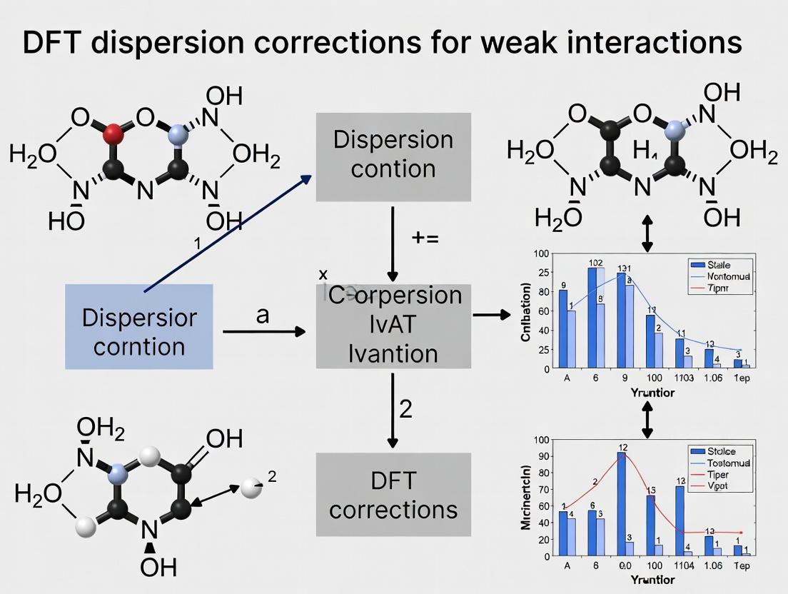 Dispersion corrections are no longer an optional add-on but an essential component of any DFT study involving weak interactions, from rational drug design to advanced materials discovery. As outlined, successful application requires a foundational understanding of the methods' physical basis, careful selection and implementation tailored to the system, vigilant troubleshooting to avoid common pitfalls, and rigorous validation against trusted benchmarks. The ongoing development of more robust, system-independent parameters (e.g., in DFT-D4) and physically grounded non-local functionals promises even greater accuracy and transferability. For biomedical research, this translates directly into more reliable in silico screening of drug candidates and a deeper atomic-level understanding of biomolecular recognition, ultimately accelerating the path to clinical application. Future directions will likely see tighter integration of these corrections with machine learning potentials and high-throughput virtual screening pipelines.