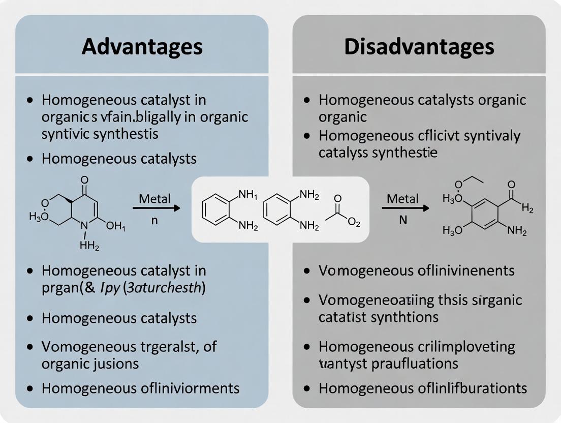 The investigation of homogeneous catalysts in biomedical R&D exists within a broader thesis weighing their distinct advantages against significant disadvantages. This framework synthesizes current data to guide selection, acknowledging that the high activity and selectivity (advantages) must be balanced against challenges in catalyst recovery and metal contamination (disadvantages). The decision is not absolute but context-dependent on the stage of R&D and the specific synthetic transformation required.